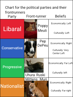 Like I said previously the thing I focus on about Raumeu is the politics. for example the current leader is Poppy! She was elected in 2022 and I the first prime minister after the Queen, Ginger aggred to become a ceremonial monarch. Poppy was re-elected in 2024. She is of the Libaral party.